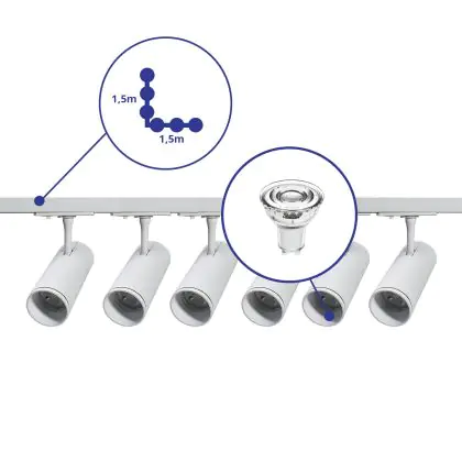 | Manufacturer Name | Complete L shaped 1-Phase Track Set White incl. 6x Spot fixture + GU10 2700K 3W Dim – 1,5 x 1,5 mete | |