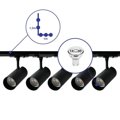 Complete Set 1-Phase Rail L 1 x 1,5 Meter Black | incl. 5x Spot + GU10 2700K 3W Dimmable + End Cap, Power Connector and L -Connector