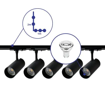 Complete Set 1-Phase Rail L 1 x 2 Meter Black | incl. 5x Spot + GU10 2700K 3W Dimmable + End Cap, Power Connector and L -Connector